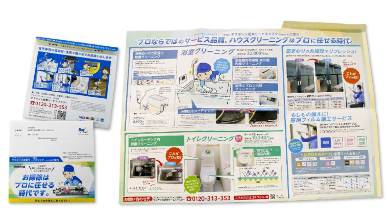 ハガキでは伝えきれなかったハウスクリーニングのプロの技術やビフォーアフターの効果を、開封後B2サイズの大判紙面で余すことなく表現。イラストや写真を大きく配置することで、サービスの価値を直感的に理解できるビジュアル訴求を実現しました。 広い紙面を活かした情報設計により、顧客の購買意欲を高め、問合せ数の増加に直結。 クリエイティブの質を妥協せず、むしろ訴求力を強化したことで、ブランド価値の向上とROI改善を同時達成しています。